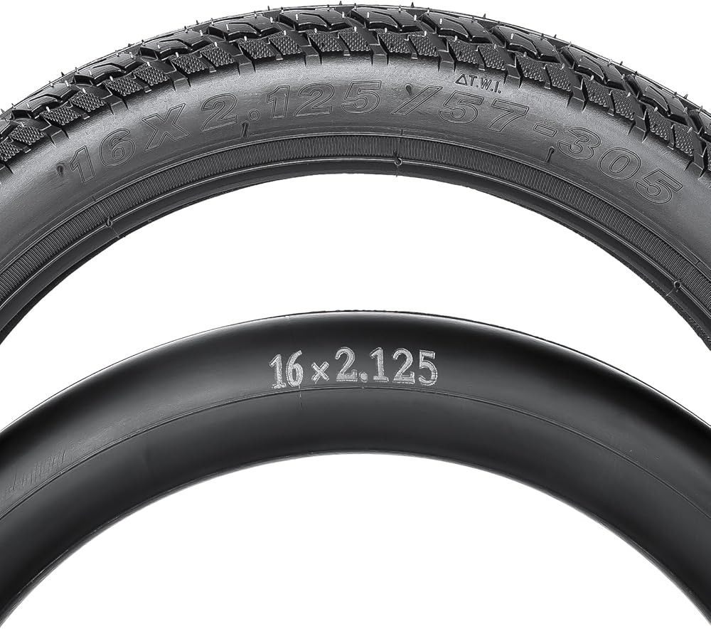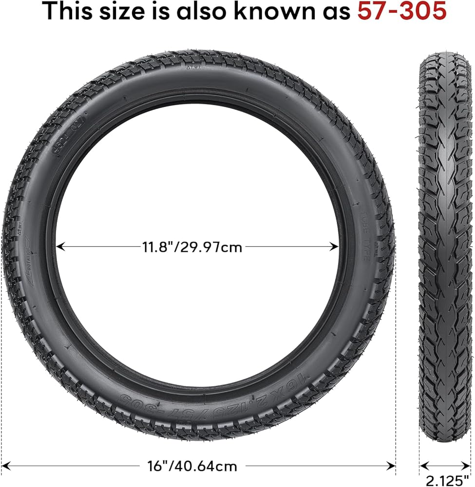 Wide Compatibility: 16x2.125(57-305) Replacement tire, outer diameter is 16in, width is 2.125in and an inner diameter (RIM Diameter) is 12 inches; Matched 16x2.125 inner tube outer diameter can be inflated to 16in, the width can be inflated to 2.125in; This 16 x 2.125 bicycle tire compatible with most kids bikes like RoyalBaby, Joystar, Dynacraf, also fit for motorcycle, electric bike, EW36 electric scooter