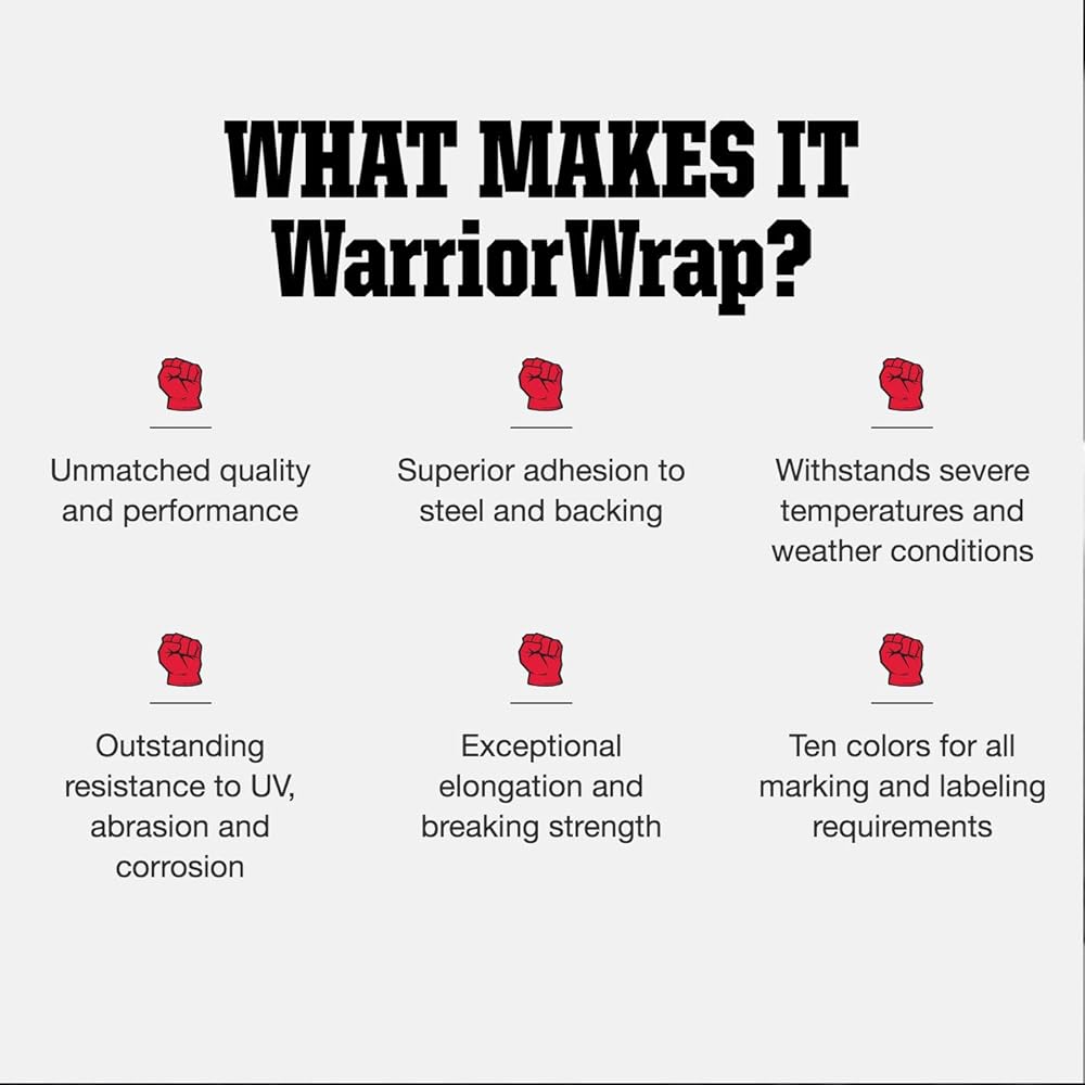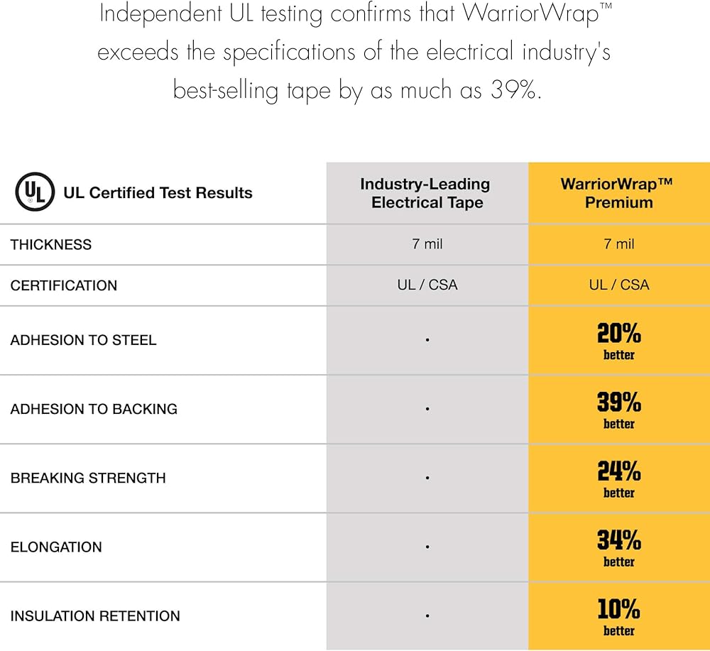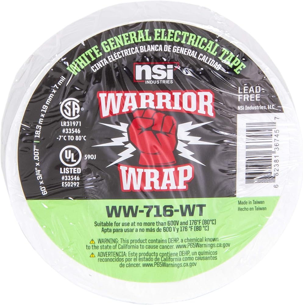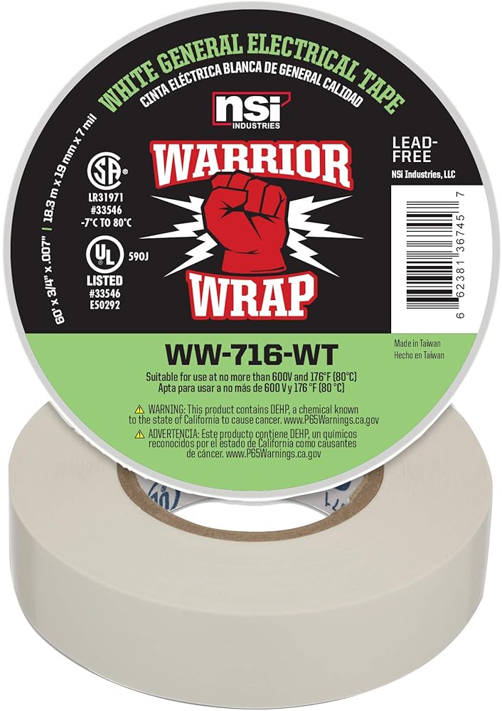 The WarriorWrap General white electrical tape provides tight and secure protection with high quality and durability, combining good adhesion, elasticity and resistance for all weather conditions. This tape can wrap up every residential or commercial project from simple jobs to complex. Withstanding weather elements without flagging, cracking or losing adhesion — from below zero to scorching temperatures — this electrical tape's rugged durability is engineered to resist harsh UV rays, rain, wind and snow. The WarriorWrap 7 mil product family is available in 10 total colors for specific project needs to help with color coding cables or labeling other items. The additional colors include black, brown, red, orange, yellow, green, blue, violet, and gray. The Warrior Wrap electrical tape product line also offers Select (WW-722) and Premium (WW-732/WW-832) tapes for enhanced performance and capabilities. The Warrior Wrap Premium line offers an 8. 5 mil thickness product available in black for the most extreme environments. WarriorWrap products are UL Listed and CSA Certified for consumer confidence, adding peace of mind to safety and quality concerns.