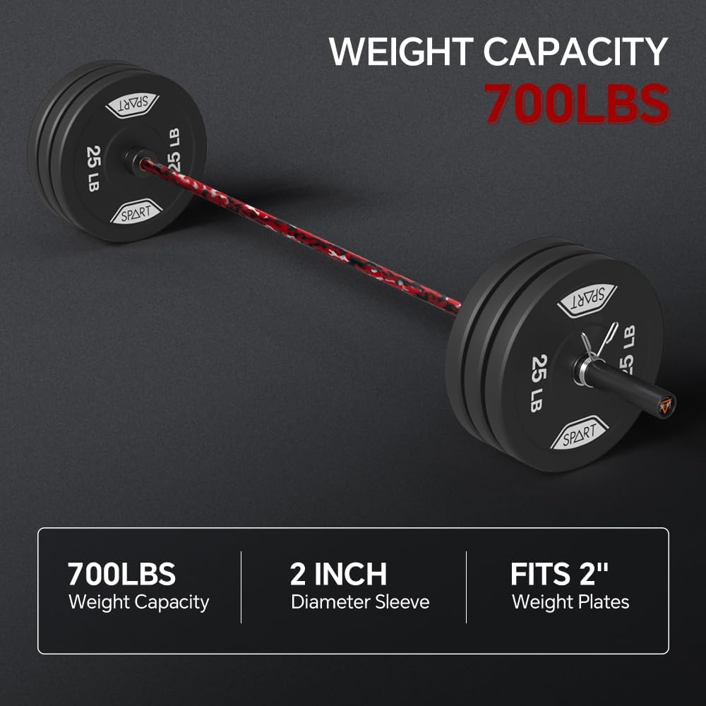 Specifications: Full length is 86inch (7ft), sufficient length allows you to do more movements. Weighs 45 lbs, a certain weight can help you build muscle. 700 pounds weight capacity, our weight bar offers real weight capacity for you to choose right weight plates and take weight lifting properly.