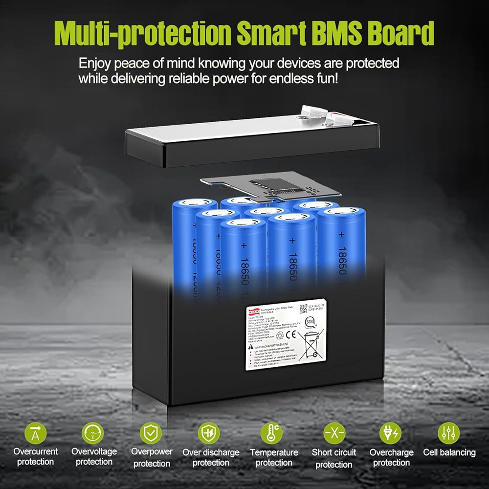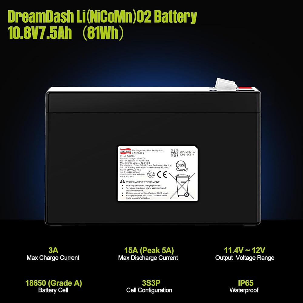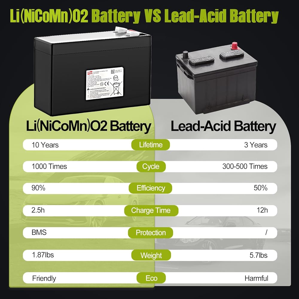 【Superior Performance】: Lithium(NiCoMn) Battery has high energy density, Long cycle life, Good safety performance, No memory effect, etc. Li(NiCoMn)O2 Battery has built-in BMS protection to prevent overcharge, Over-discharge, Over-current and short circuit, and very low self-discharge rate. (Not motorcycle starter battery)