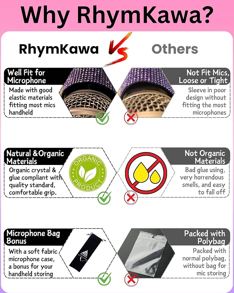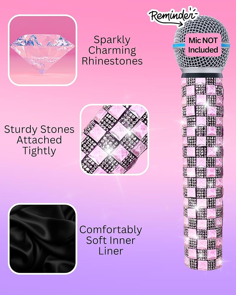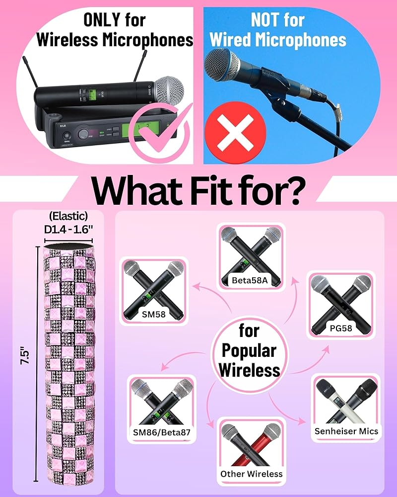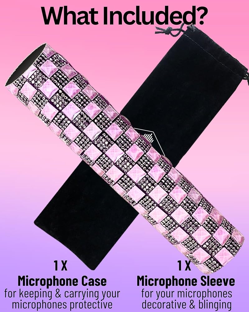 Shining bling colored cover for universal with the size of 1.5-1.7 inches in diameter, length not exceeding 7.5 inches handheld body housing, AAAAA-Grade Rhinestones. Firm fit and microphone specific to make and model.