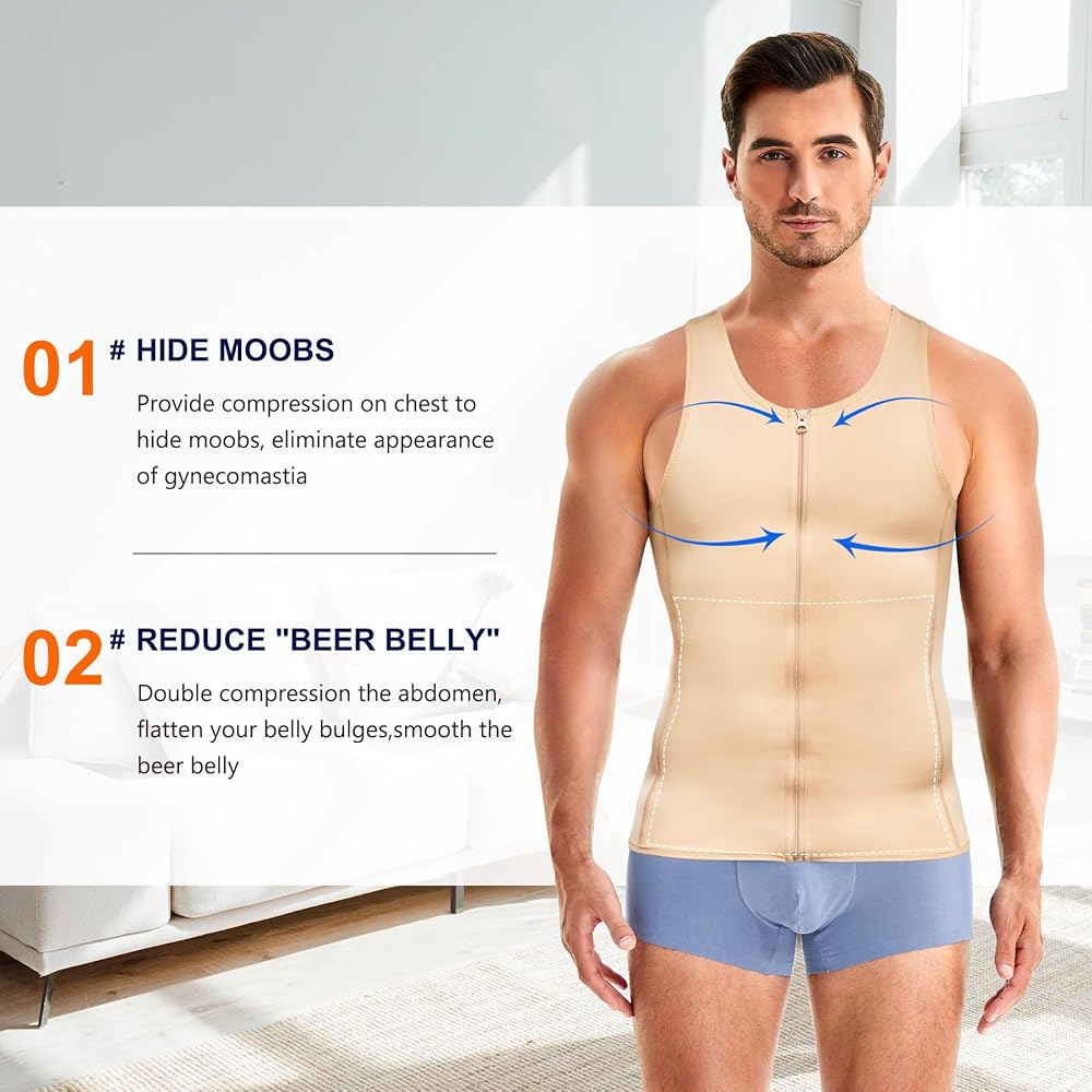 NEW DESIGN COMPRESSION BODY SHAPER:The upgrade shapewear for men with inner 3 rows of hook &eye closure and outer zipper closure can provide full coverage and tight compression to your lower fat belly and love handles,flatten abdomen, provide tummy control and great back support.It's easy to put on and take off,give you an instant slim look and good body shape.
