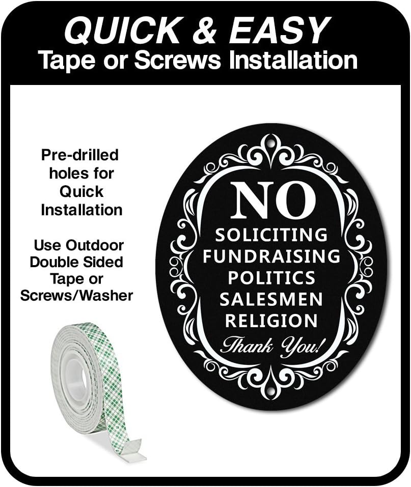 Effortless Installation: This no soliciting sticker can be easily mounted above the doorbell, on the front door, or on the wall. Pre-drilled holes make installation quick and hassle-free.