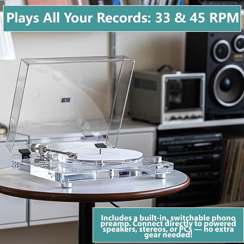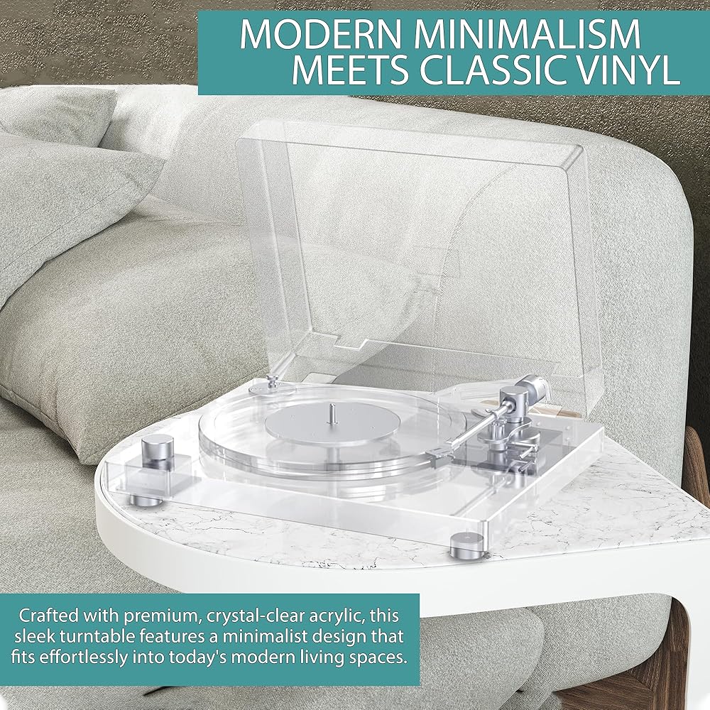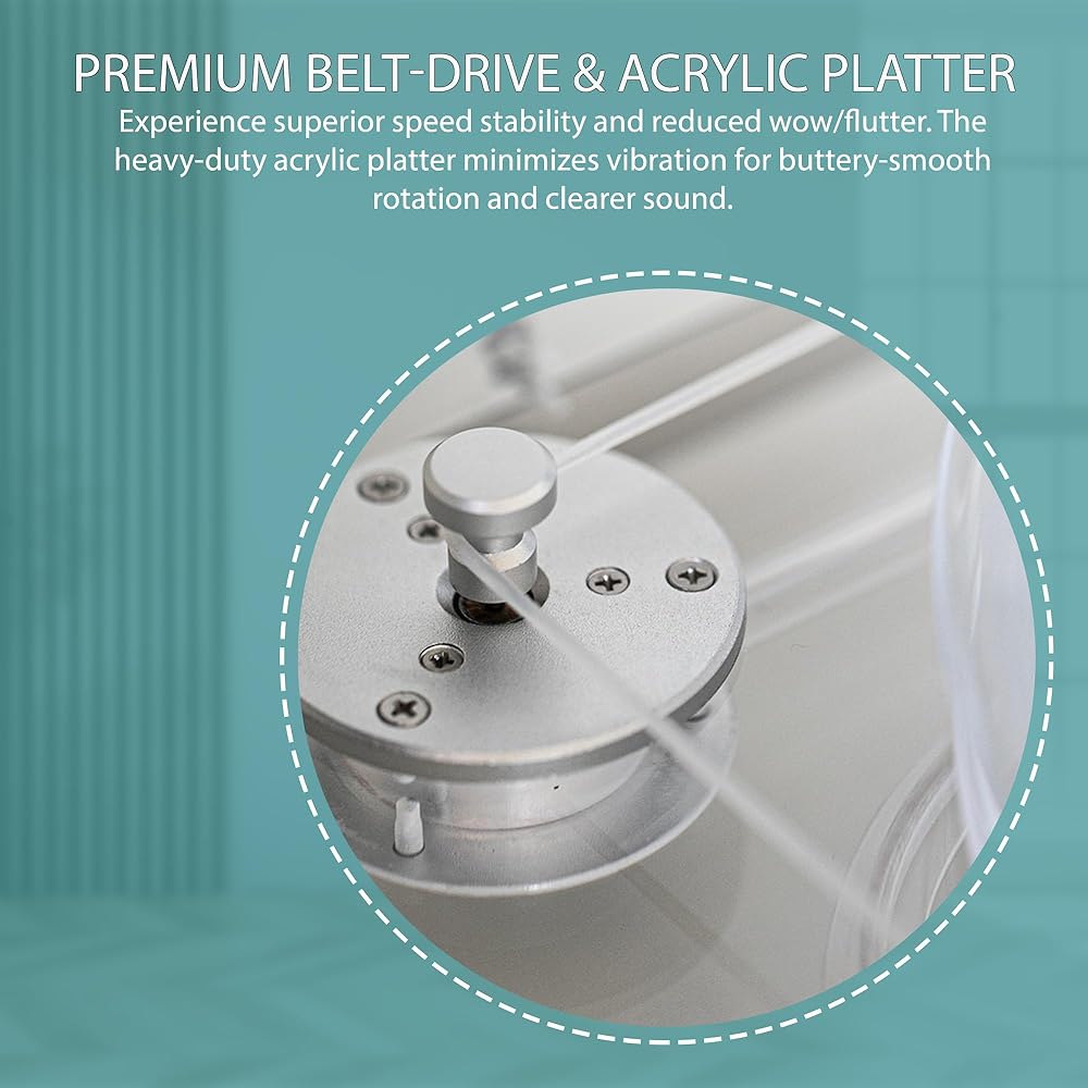 Pure Acrylic Soundstage & Anti-Resonance Mastery:Elevate your vinyl journey with a record player featuring full acrylic construction from base to platter. Coupled with a weighted anti-vibration platform, it cuts resonance for flawless speed stability and dynamic audio clarity. The precision calibration dial lets you fine-tune tracking force effortlessly across all vinyl records.