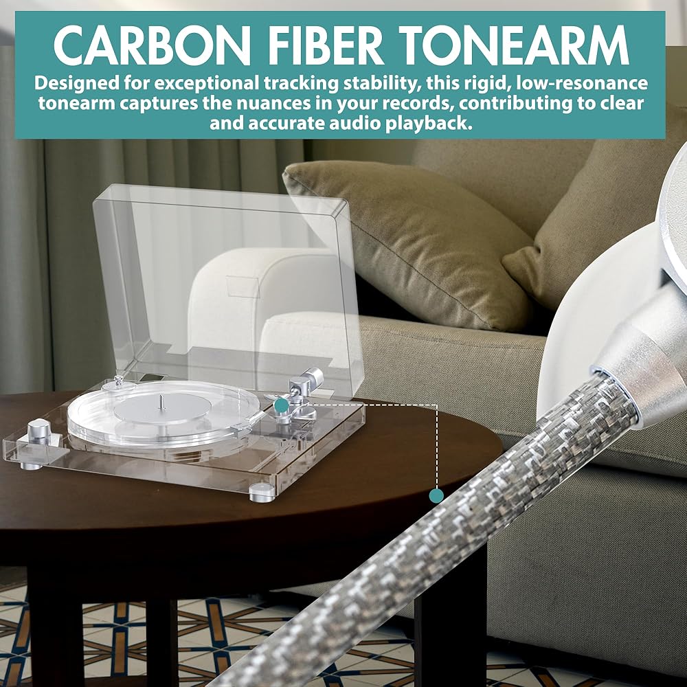 Carbon Fiber Precision: Hear Every Whisper,Our turntable's aerospace-grade carbon fiber tonearm slashes distortion to near zero. Its stable tracking hugs grooves like a magnet, revealing buried details in vinyl records for crisp, faithful sound reproduction. This is how turntables for vinyl records should perform.