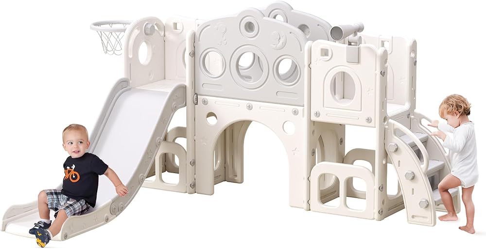 Educational Toddler Slide Set: Special reminder: Applicable age: 1-3!Our toddler slide set offers a slide, an arch, a storage, a basketball hoop, a telescope, a 3-level stair and a corridor.