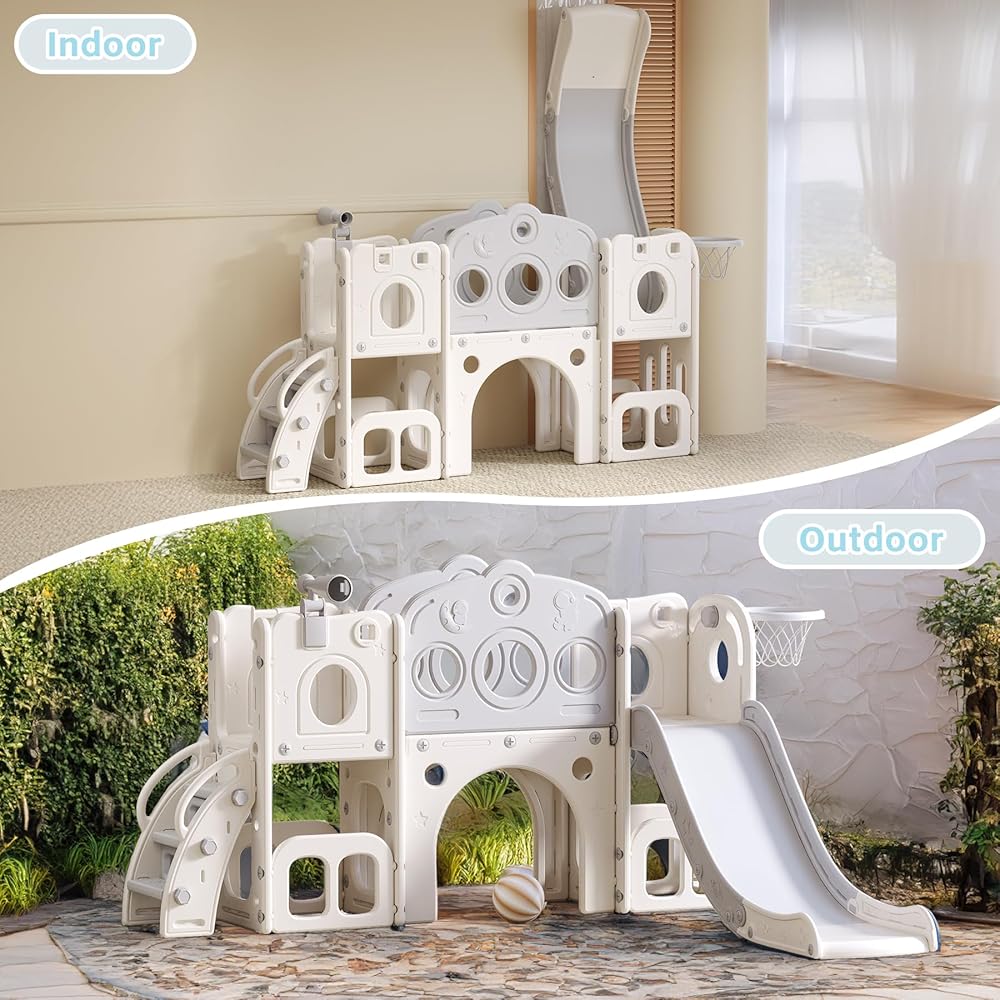 8 in 1 Toddler Slide, Outdoor Indoor Playset for Kids Baby Age 1-3, Childs Climber Slide with Storage Space and Non-Slip Steps, Basketball Hoopa and Telescope, Grey & White