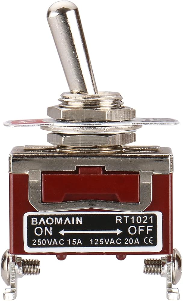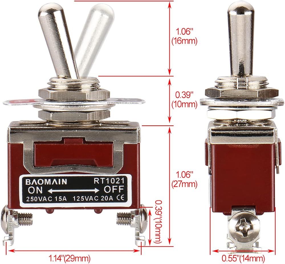 DPST toggle switch with screw terminals. 125 VAC, 20 amp. 1/2" mounting hole. If you need the toggle switch with UL listed,Please search the ASIN:B07D6DX39W.