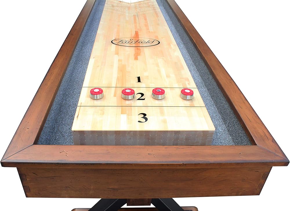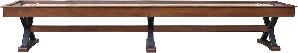 The Santa feel shuffleboards are part of the Pro-Series Fairfield collection of game tables by Playcraft. The Santa fe's rugged steel x legs combine with distressed hardwood stained in a rich cocoa Bean to complete the popular rustic industrial design style and sure to be make a statement in your game room. More than just beautiful furniture, the high-quality materials and construction will ensure many years of enjoyable shuffleboard games with family and friends. Optional two-piece playfield available for locations with difficult access