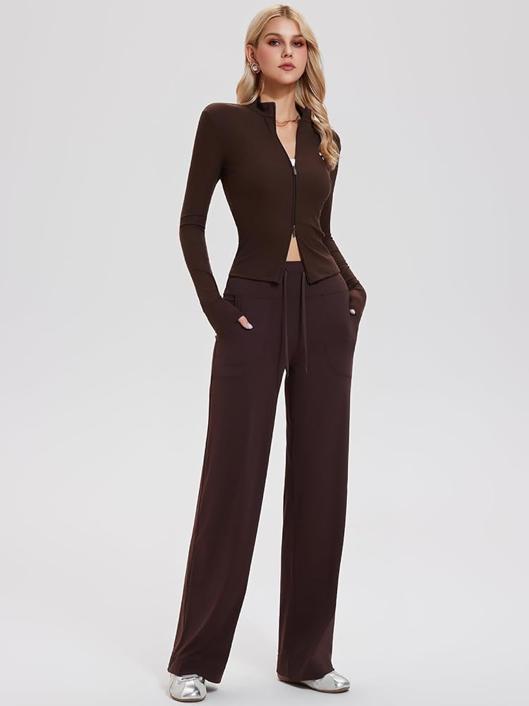 Wide Leg Pants with Pockets: The matching high-waist wide leg pants feature an adjustable drawstring and two deep side pockets for phones, keys, or cards. Comfortable yet chic, these lounge joggers create a flattering silhouette that elongates the legs. Ideal as vacation pants, yoga bottoms, or daily shopping outfits, they complete a versatile women's sweatsuit set for both active and relaxed lifestyles