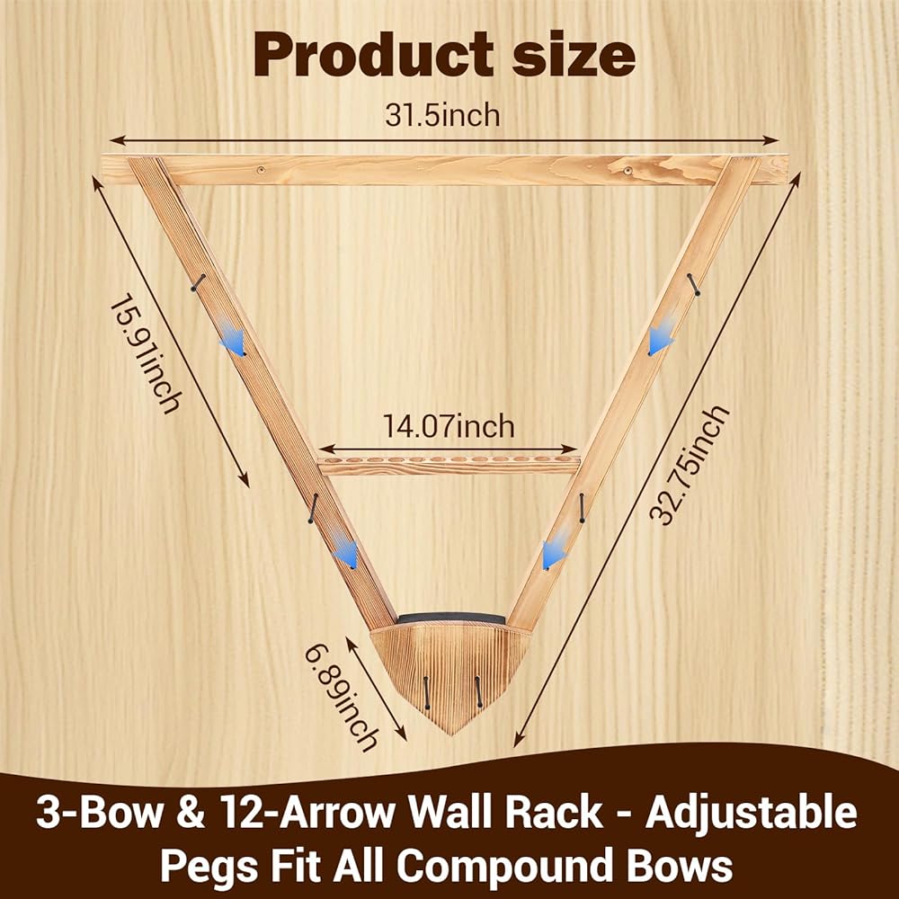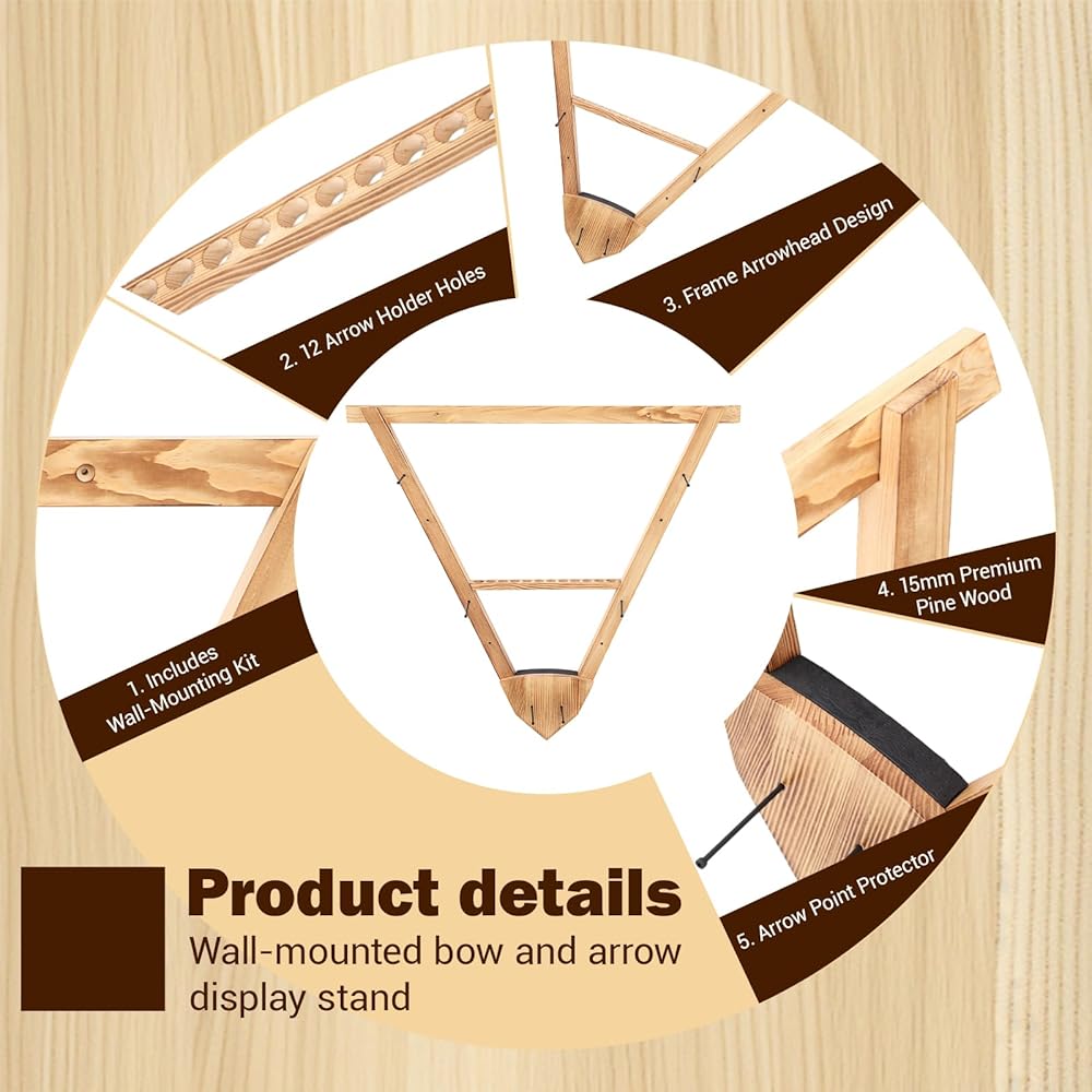 Quality Material: crafted from sturdy pine wood and coated with two layers of varnish, this wall-mounted bow holder enhances both aesthetics and longevity; The natural wood grain adds a rustic charm while ensuring reliable support for compound bows and recurve bows