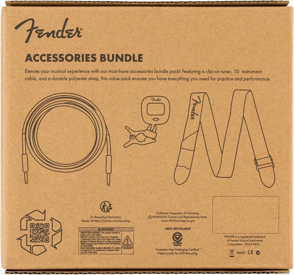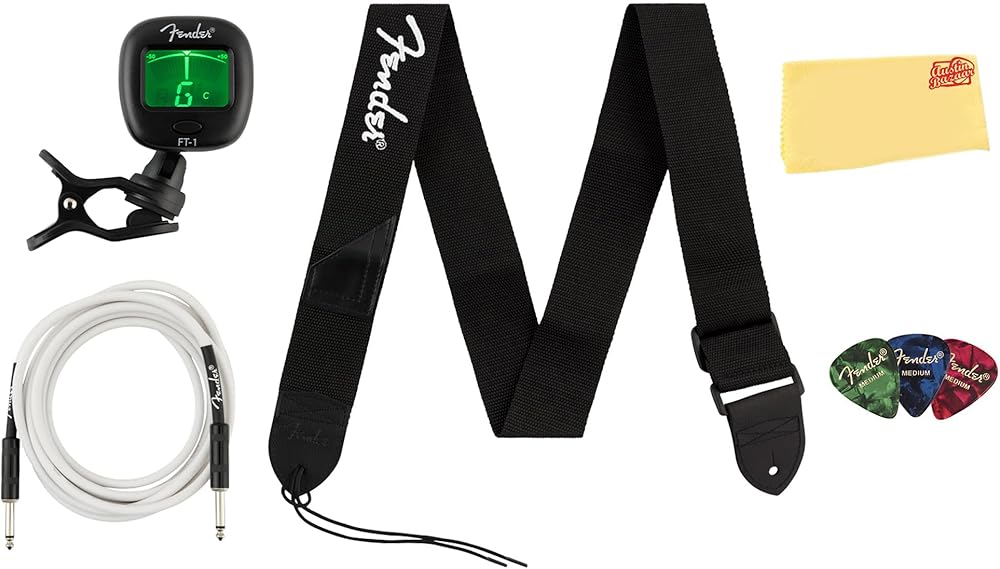 The Accessory Essentials Pack is a practical bundle for guitarists and bassists, offering three essential Fender accessories to support your practice and performance. It includes a sturdy 2” polyester strap with a classic white Fender logo, a 10' white PVC instrument cable with straight-to-straight connectors for dependable sound, and a clip-on tuner for quick and accurate tuning. Suitable for players of all skill levels, this value pack provides reliable quality and convenience, making it an essential addition to your gear collection.