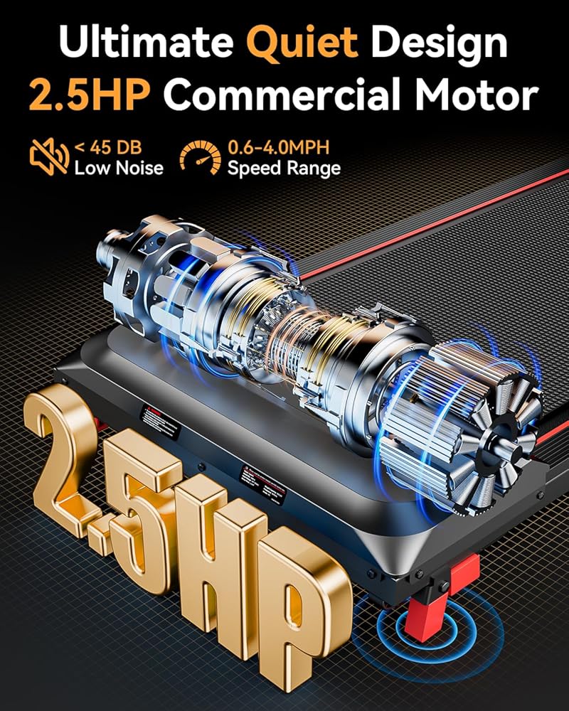 2.5HP MOTOR LOW NOISE OPERATION: The treadmill is equipped with a 2.5HP high-performance motor, which provides stable and strong power support and ensures smooth running of the running belt. Built with high quality materials and exquisite craftsmanship, it has excellent weight capacity of 265lbs.