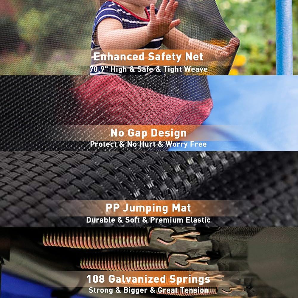 【Superior Bounce Experience】72 rust-resistant galvanized trampoline springs securely attach the tightly woven jumping mat and frame together, offering superior and impressive bounce. The jumping mat made of PP material with premium elasticity-back property allowing kids to jump higher and merrier.