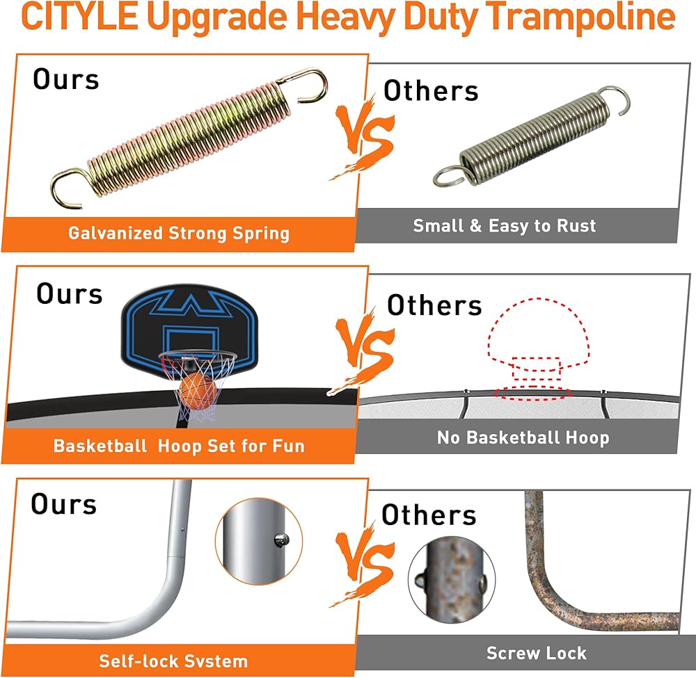 【Safety First】12 FT Trampoline is equipt with 6ft high safety enclosure and heavy gauge galvanized rust resistance steel construction. 6 W-shaped legs secures the stability. We have comprehensive testing of the chemical composition of the material and the structure design of the product to ensure its safety.