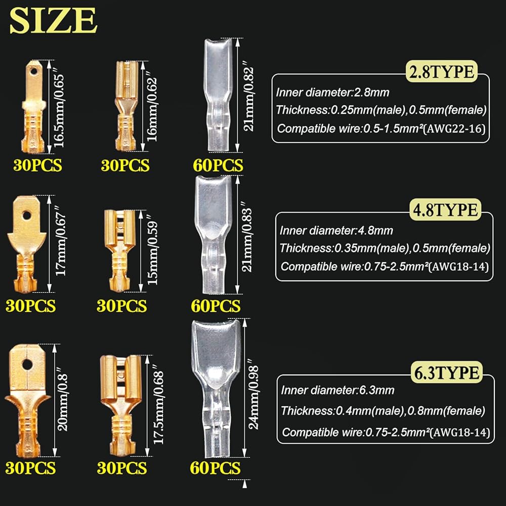 Package:It include each 30 2.8mm/4.8mm/6.3mm male and female crimp terminal connector block and each 60 2.8mm/4.8mm/6.3mm insulating sleeves packed in a plastic box