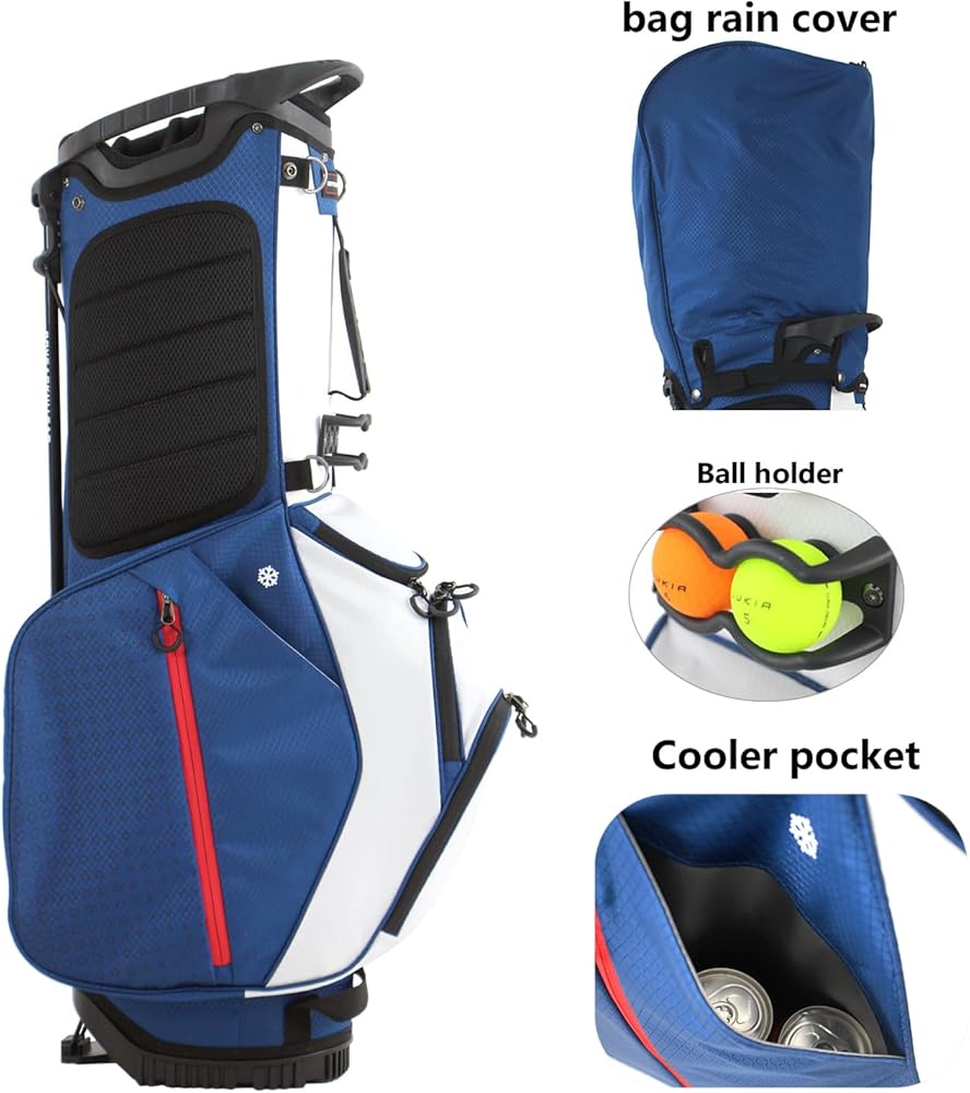Storage solution: The golf bag has a total of 7 storage pockets, 1 waterproof pocket for valuable items, 1 large-capacity full-length clothing pocket, 4 other storage pockets, and 1 water bottle cooler pocket. External glove/towel holder, umbrella holder etc. This golf bag can make it more convenient for you to play golf.