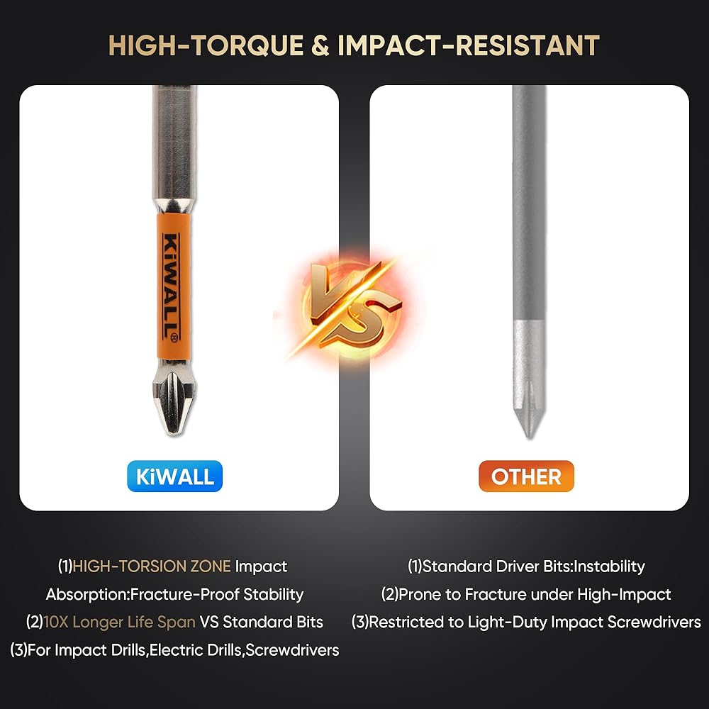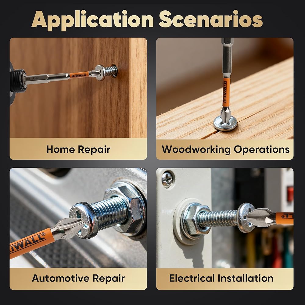 【ANTI-SLIP PRECISION TIP – PERFECT FIT EVERY TIME】CNC machined precision tips ensure an exact fit with PH2 screws, minimizing screw stripping and increasing driving efficiency. Each bit offers smooth engagement and maximum torque transfer for professional-grade performance