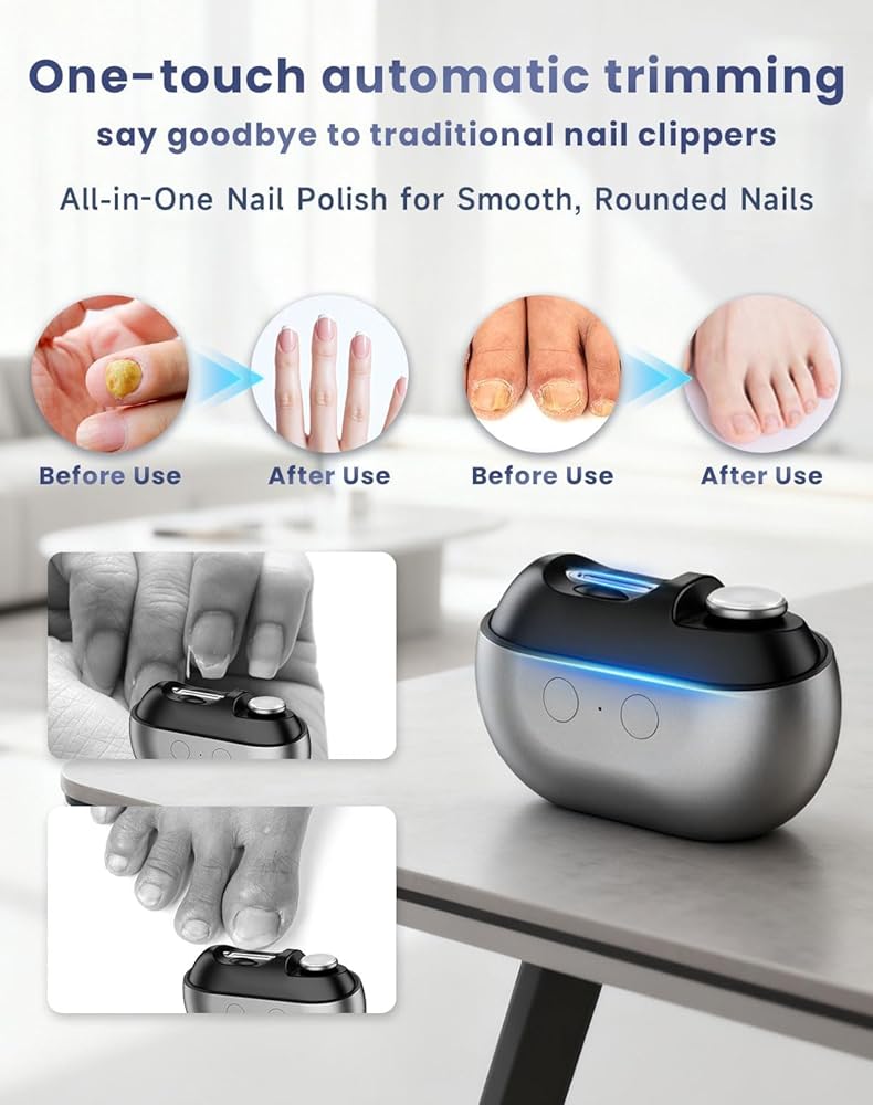 【One-Touch Start, Effortless and Convenient】 Designed to tackle the challenge of trimming thick and hard nails, this product features a one-touch start design. With a simple press, it utilizes high-quality steel blades to complete the trimming, significantly saving hand strength. It is especially convenient for seniors or those with reduced hand strength.