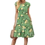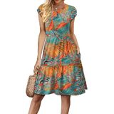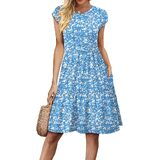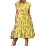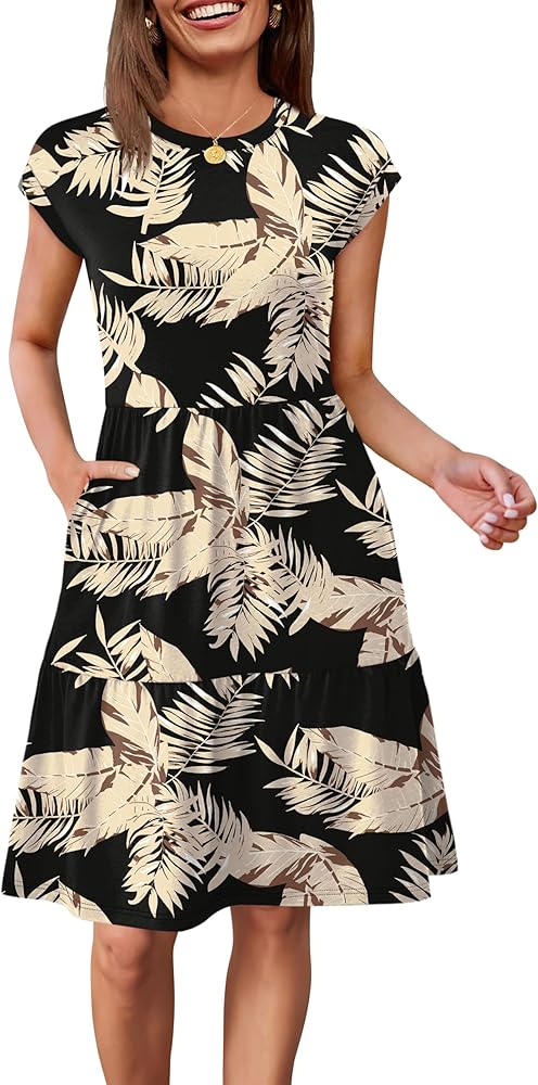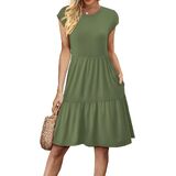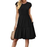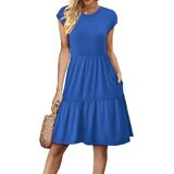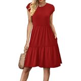 Features: A cute baby doll dress with a round neck and cap sleeves. The tiered design with pockets adds charm and practicality, perfect as a casual mini dress or a sundress for everyday wear.