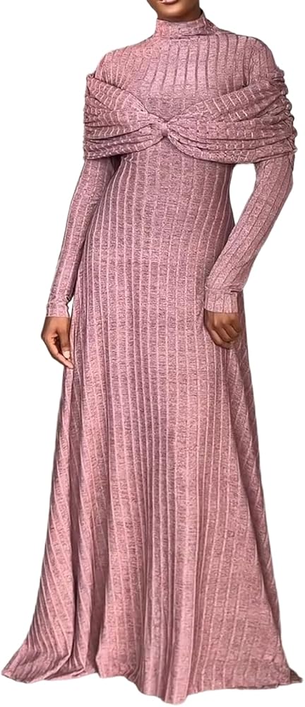 FEATURES: Subversive design ethos lends inside-out intrigue to this ribbed knitted dress. This long dress is perfect for any occasion. It features a high neckline with an off the shoulder bandeau design, long sleeves, rear zip fastening with back zipper, pleat detailing, draped silhouette, snug-fitting at the top, fit-and-flare silhouette, and elegant maxi length for timeless allure.