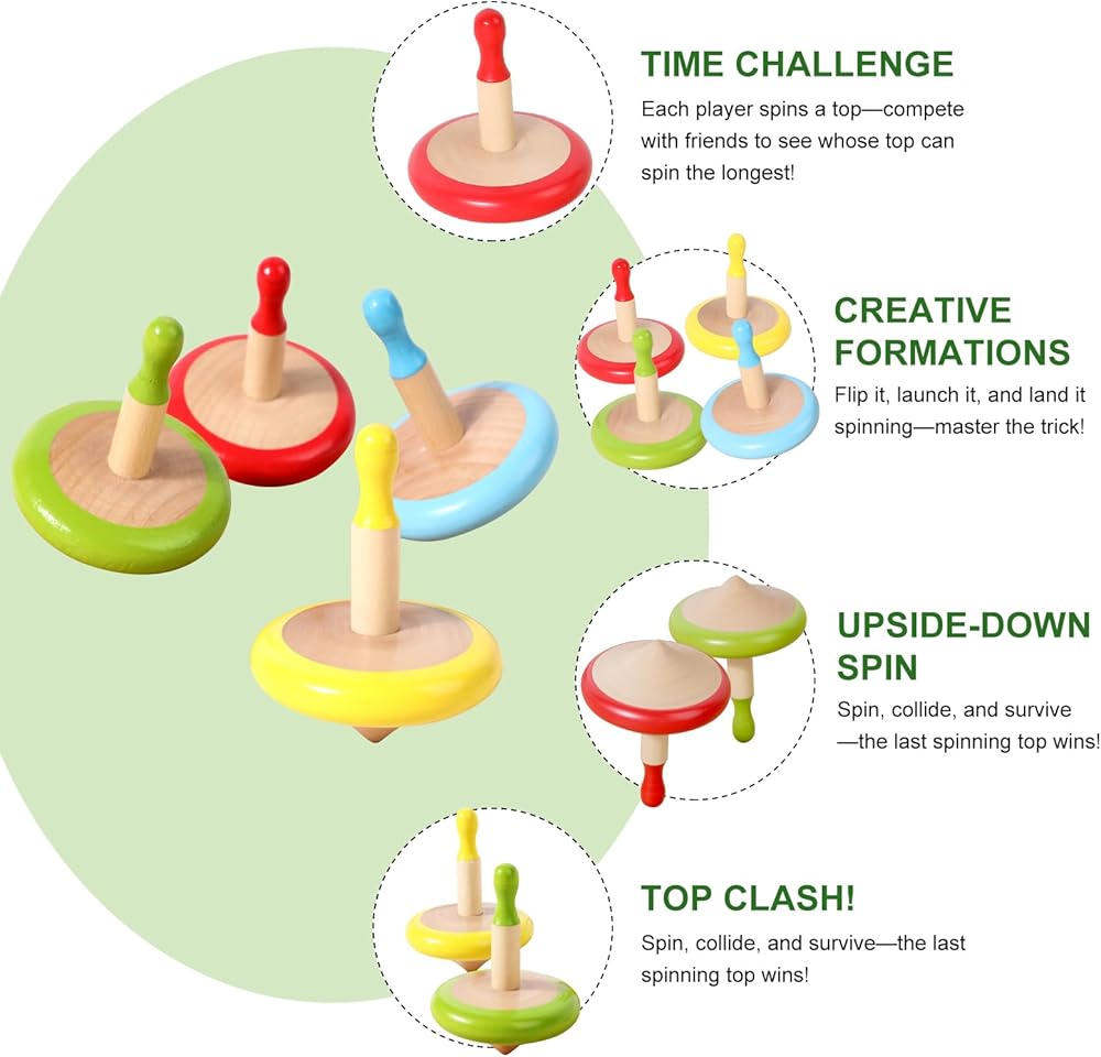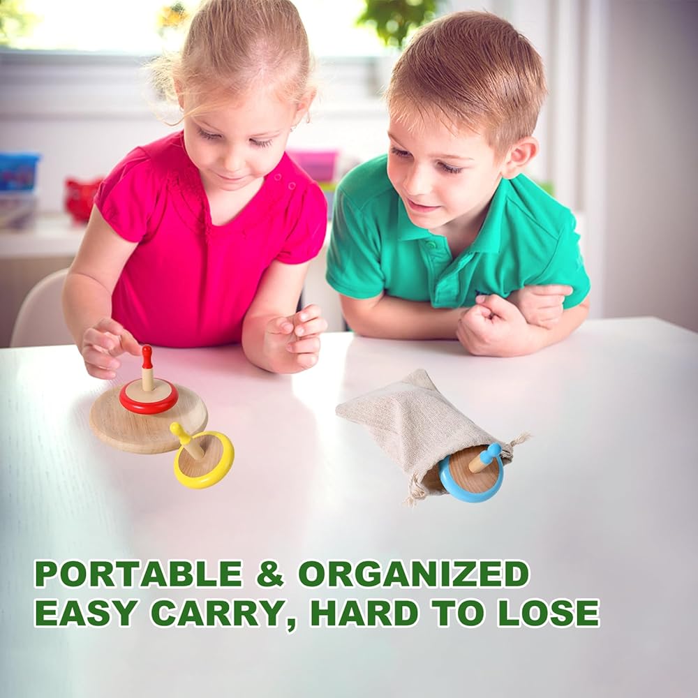 Bright & Non-Toxic Colors for Safe Play Each wooden spinning top features vibrant, child-safe paint in eye-catching yellow, green, red, and blue. The non-toxic, eco-friendly colors enhance visual stimulation while being completely safe for toddlers and children.