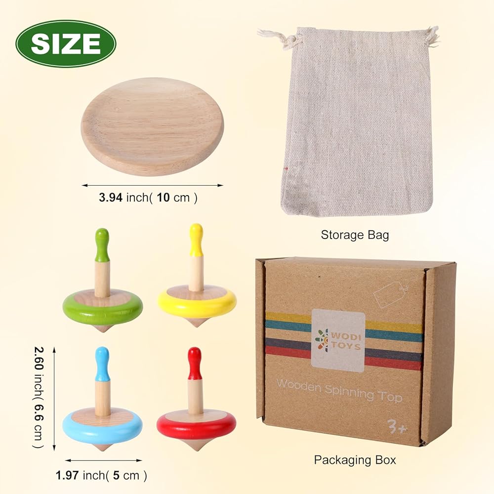Perfect Gift for All Ages An ideal gift for birthdays, holidays, or STEM learning, these handmade wooden tops appeal to all ages. Great for toddlers, preschoolers, and adults who love timeless, screen-free toys or stress-relieving fidget play. Package Includes: 3-4 wooden spinning tops per set (styles vary by SKU) + reusable cotton storage bag,4pcs comes with a tray, 3pcs comes without a tray