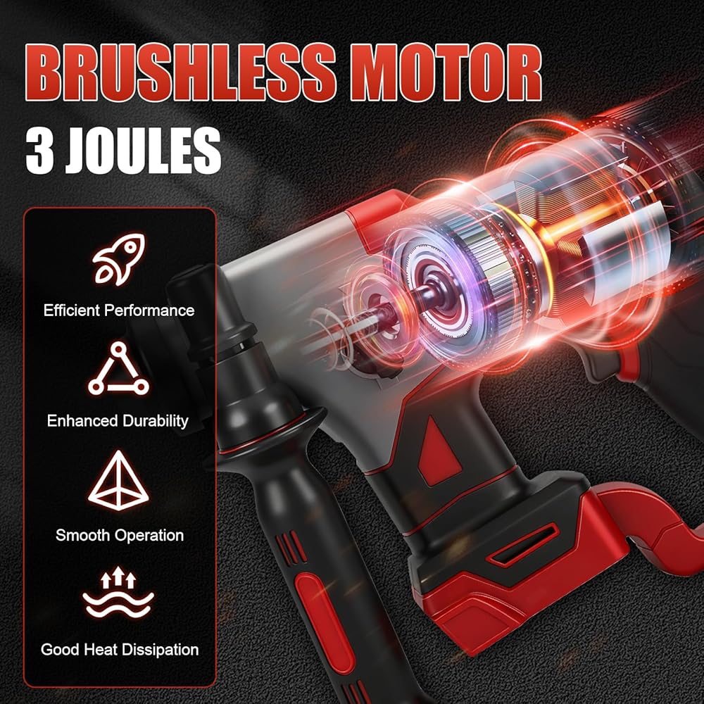 SDS Plus Rotary Hammer Drill for Milwaukee 18V Battery, 3J Impact Brushless Rotary Hammer with 2 Mode Operation, Cordless Hammer Drill with 3 SDS Plus Bits & Chisel Set (No Battery)