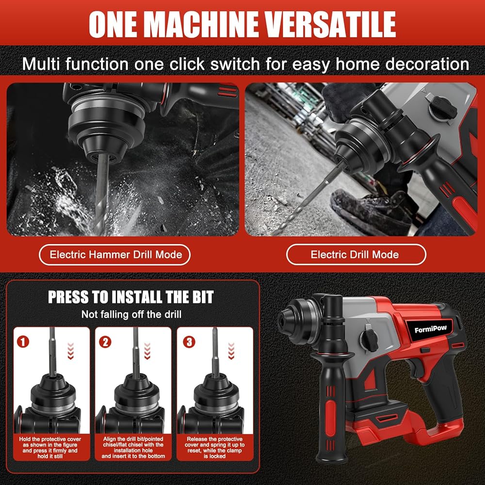 【Complete Kit, Ready for Work Right Out of The Box】Get started immediately. This kit includes the cordless hammer drill, 3 SDS-Plus drill bits, pointed chisel, flat chisel, 13mm wrench chuck, 1/2" adapter, and manual. The wrench chuck allows quick use of standard round-shank bits, maximizing your tool's versatility.