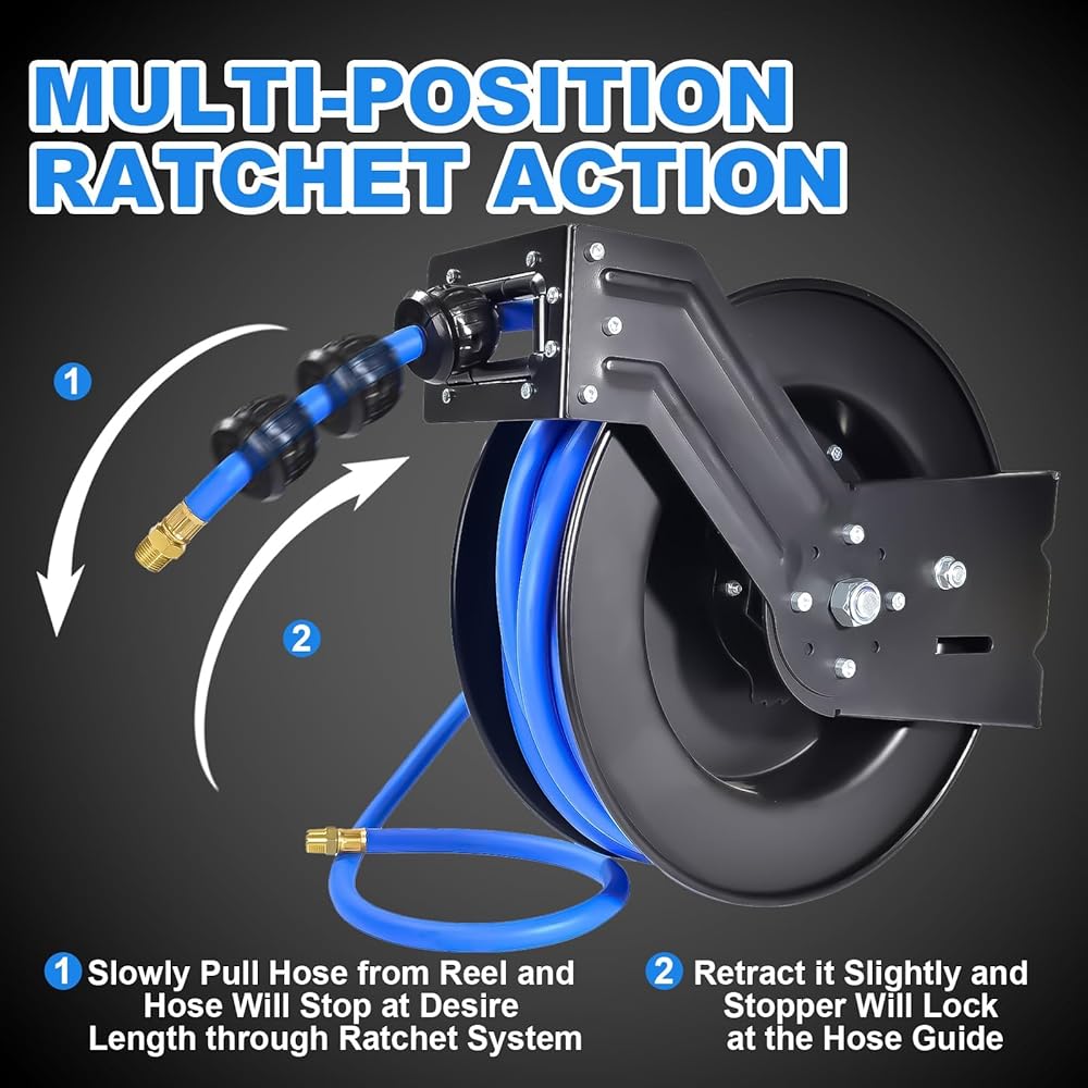 This air hose reel keep your garage safe and clutter free with the Aain Heavy-Duty Air Hose Reel. Premium all steel construction.