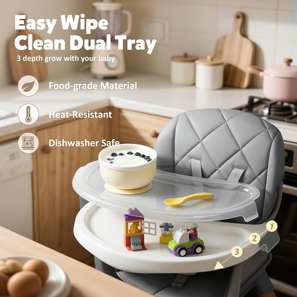 Removable & Adjustable Tray: Baby high chair equipped with removable tray for eating and feeding and footrest for storing toys; The tray can be adjusted to 3 positions, providing more space for fast growing children