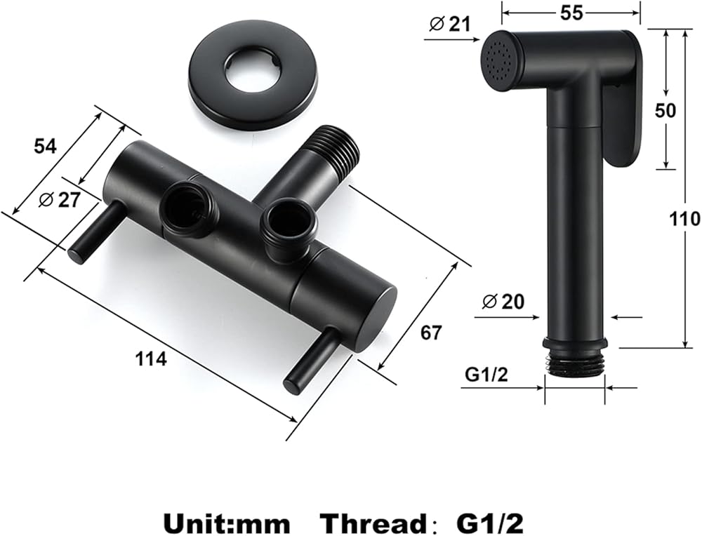 Products Include: Handheld Bidet Sprayer + One-in-two-out angle valve(With decorative cover)+ 1.5m spring hose + Stainless steel shower base(Including screw pack, hex key)