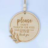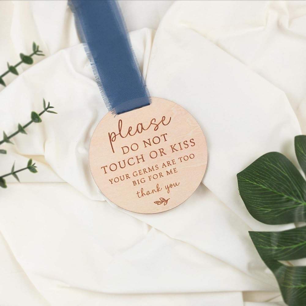 This 4-1/4" no touch and no kiss baby wooden sign comes with a 15" pink chiffon ribbon. This sign is the perfect way to inform your friends, family and strangers to keep distance from your baby while he/she builds their immune system. The color may differ slightly due to photographic lighting or your monitor settings. CAUTION: This item is not intended to be used as a toy. Please always supervise your children around the item.