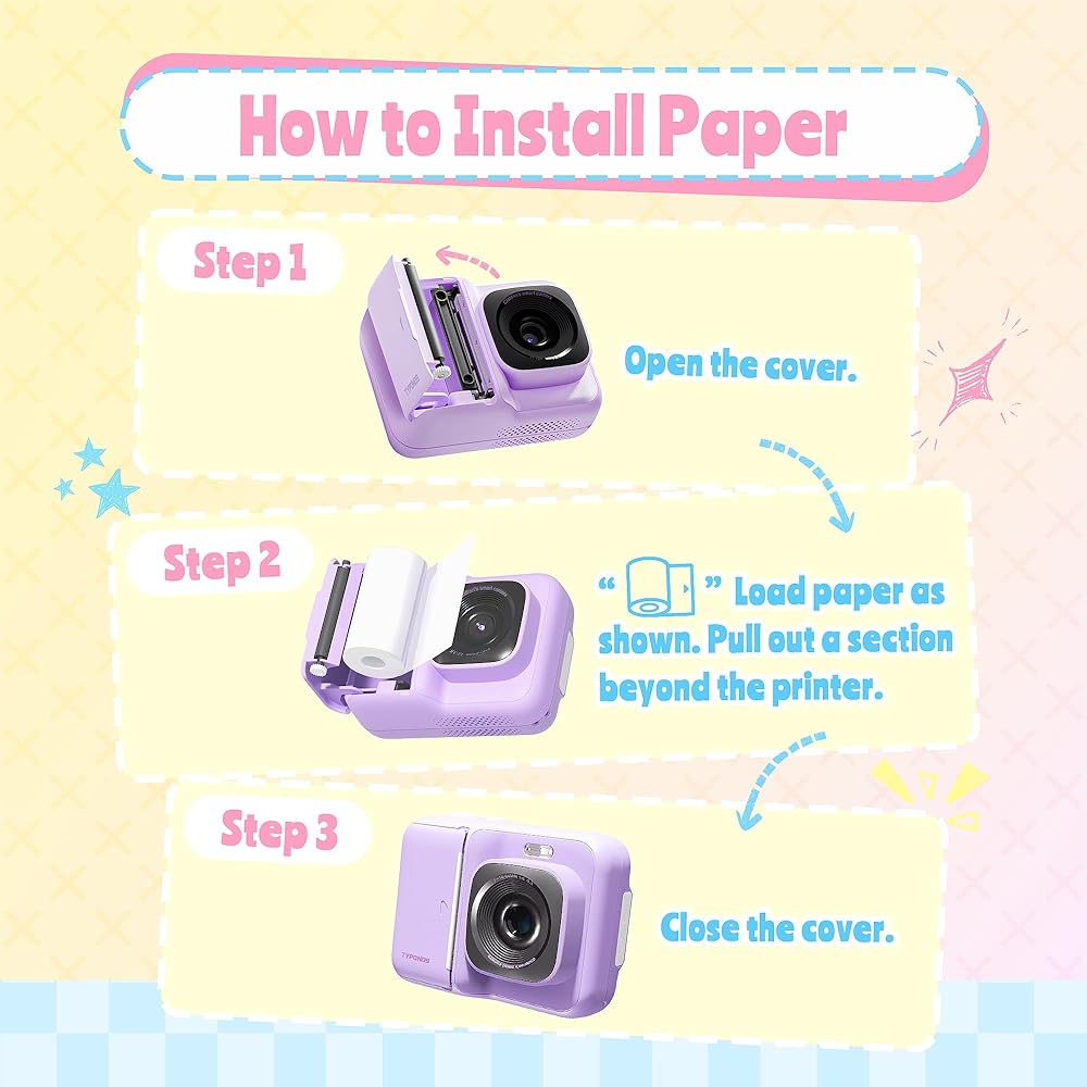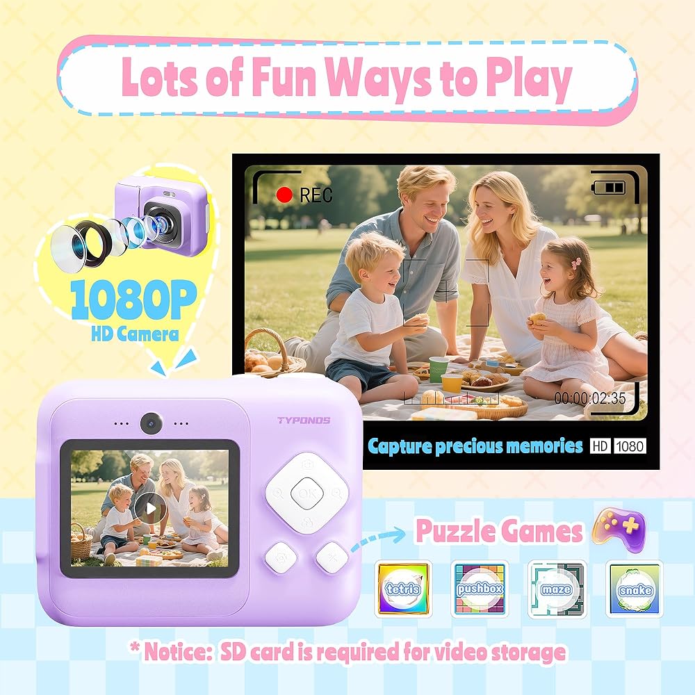 Safe, Portable & Kid-Friendly Instant Print Camera: This instant print camera for kids has a shockproof design and includes a lightweight lanyard. It uses safe, BPA-free thermal paper, so parents can relax. Compact and easy to carry, this kid camera is great for trips and outings. As a kids instant print camera, it lets children capture and print memories anywhere. A fun and safe gift, this kids camera instant print helps kids treasure their favorite moments!
