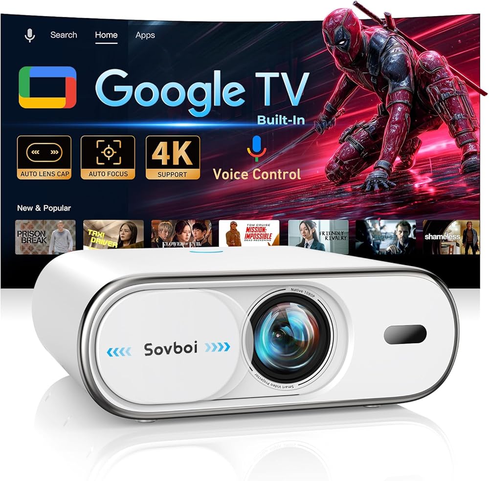 【Smart Projector Compatible with Google TV: Break Free from App Restrictions】 Sovboi E30Max projector gives full access to the Google Play Store, letting you freely download 10,000+ apps with no restrictions and enjoy quick access for Netflix, Disney+, and HBO Max – ending compatibility worries! Equipped with an upgraded chip, this 4K projector delivers sharp, vibrant projection with real-time image optimization and near-zero lag during casting to iOS, Android, Mac, and Windows devices. Its ultra-user-friendly system is simpler to set up than installing apps on your phone: just sign in and stream to start your happy movie night