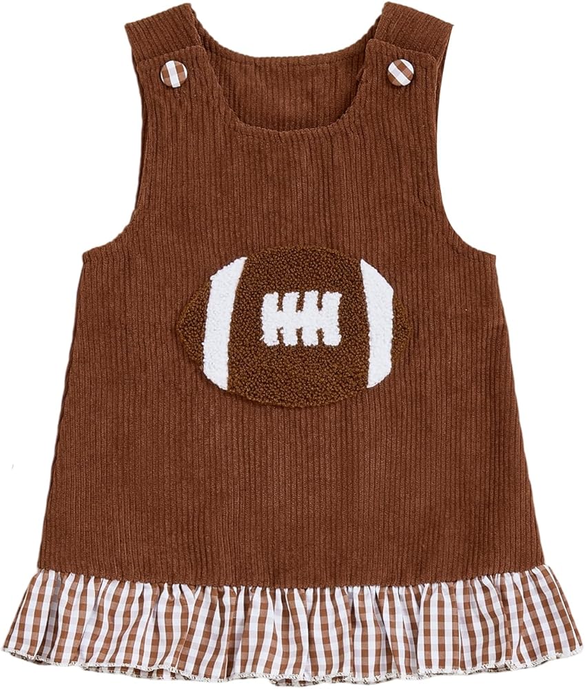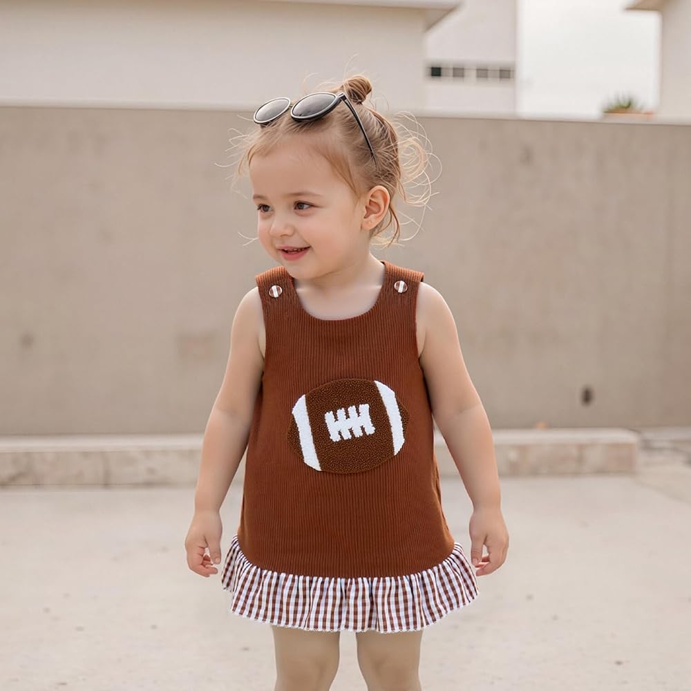 Craftsmanship Design: Toddler baby girl football clothes, baby girl football outfit, baby girl football dress, fall baby girl clothes, winter baby girl clothes, toddler girl corduroy dress, baby girl fall dress, sleeveless dress for girls is finely crafted; The plaid ruffled hem and curte football embroidery design, adding a sense of fashion and a strong fashion atmosphere