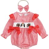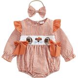 GINEVSAL Baby Girl Football Smocked Outfit Plaid Rugby Animal Embroidered Crew Neck Long Sleeve Romper with Headband