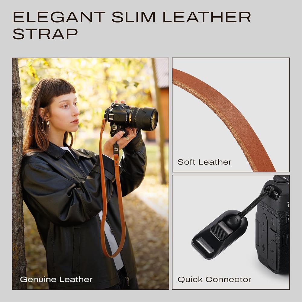 • Soft Genuine Leather: Crafted from soft genuine leather, this slim leather camera strap offers a smooth feel and long-lasting comfort. Ideal for daily shoots, it delivers a premium touch to your camera without adding bulk.