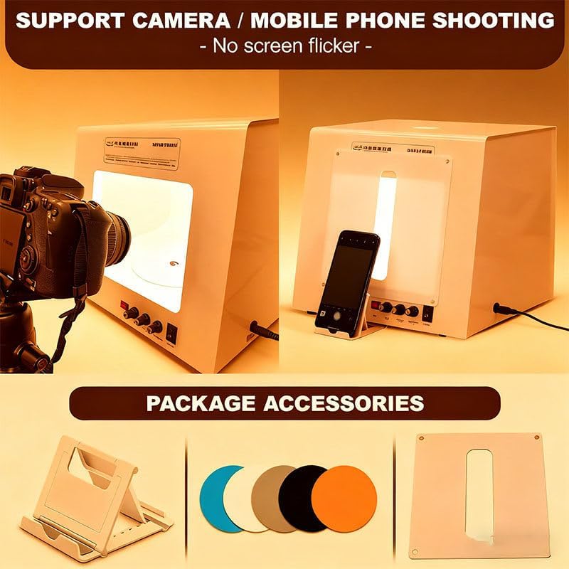 【shooting accessories】- Equipped with additional accessories: mobile phone holder*1/rotating table reflection board*5/ acrylic baffle*1/Star Filters*1/Black Background*1/Necklace hanging rotating motor*1. Hope these accessories can help you take better professional photos or videos.