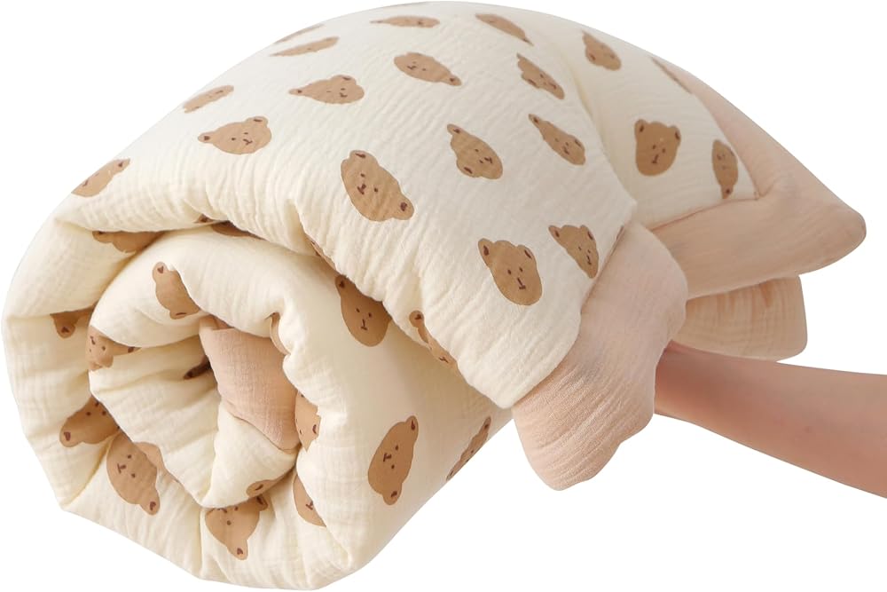 COMFORTABLE FABRIC & FILLING: The outer layer is made from double-layer cotton muslin fabric—soft, breathable, and ideal for delicate skin. It's durable, resistant to fading and pilling, and becomes even softer over time. Filled with a down-alternative blend that includes 20% soy fiber, this crib comforter offers just the right weight to help keep your baby comfortable throughout the year