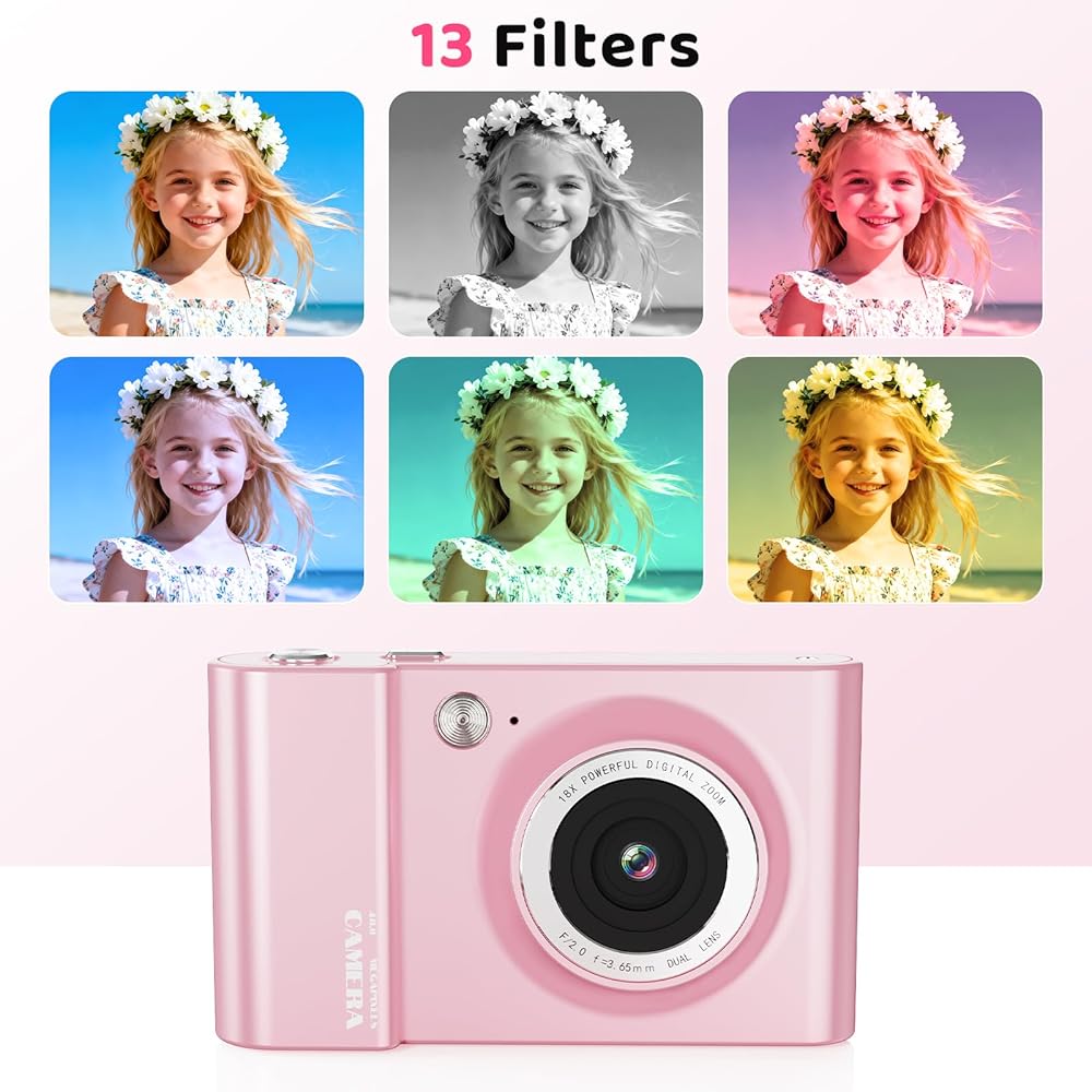 📸【64MP High-Resolution Photos & Creative Filters】Equipped with a high-quality CCD sensor, the kids camera has up to 64MP pixels and 12 built-in filters to spark creativity and make every shot stand out.