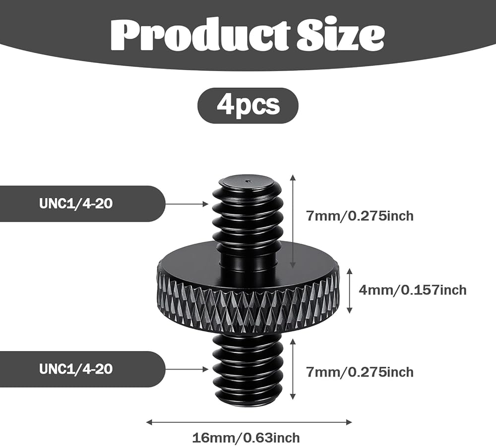 Secure Connection: Measuring 0.7 inch/18mm in length and 0.62 inch/16mm in diameter, this 1/4" male to 1/4" male tripod screw ensures a precise and secure connection between your camera, rig, or lighting equipment, delivering stable performance even under demanding shooting conditions.