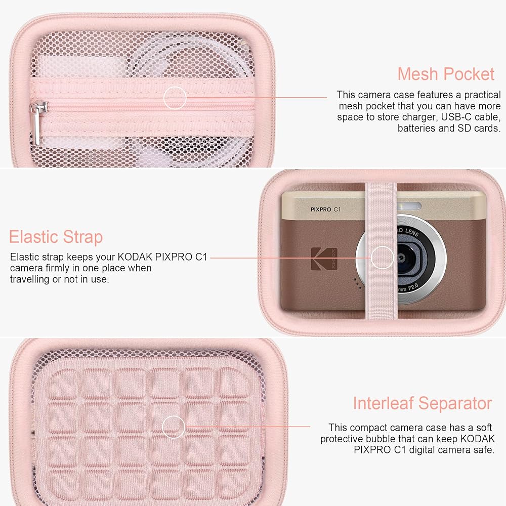 Perfect Fit: This hardshell digital camera case is specifically designed for KODAK PIXPRO C1 Friendly Zoom digital camera. With external dimensions of 5.18 x 3.84 x 2.58 inches, it offers a precise fit for the KODAK PIXPRO C1 Friendly Zoom compact point-and-shoot camera, along with its charging adapter, spare battery, USB cables, memory card, and KODAK PIXPRO C1 accessories. (Note: Case only; digital camera and accessories are not included.)