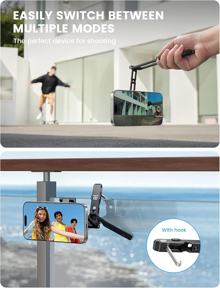 5 NI 1 Design: This mini tripod for iPhone seamlessly adapts to your shooting style. Use it as a stable bedstand desktop stand, extend it into a full-length selfie stick, or switch to handheld mode for dynamic low-angle shots. Its unique mantis hook can securely grip onto railings, chair backs, and tray tables. This tripod covers all your needs, from professional filming to everyday moments.