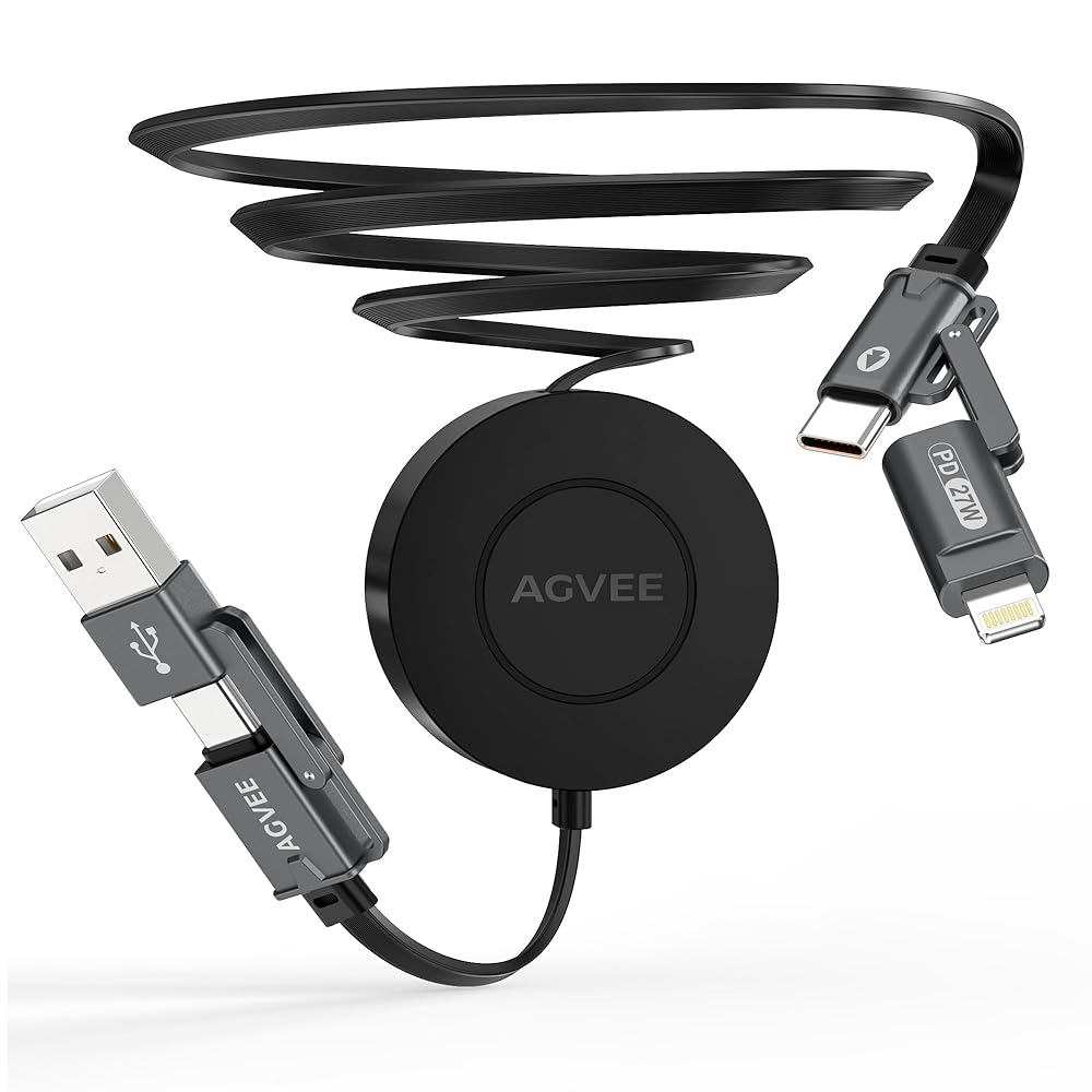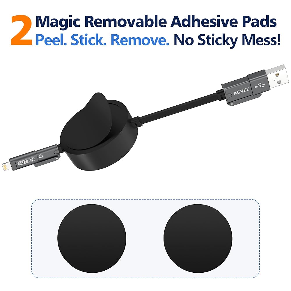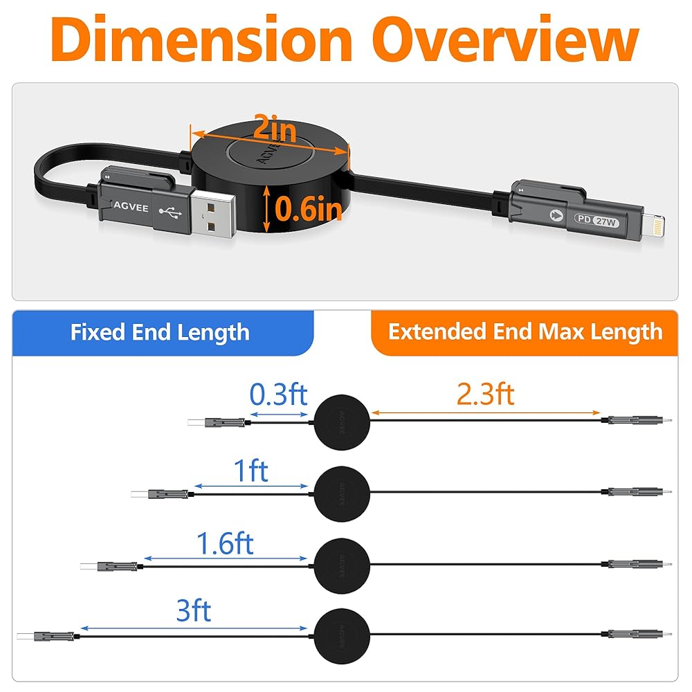 AGVEE 0.3ft Fixed / 2.3ft Extend 4 in 1 Multi USB Charger Cable Mountable One Way Retractable 60W Fast Charging Cord, Pocket-Sized for iPhone 16 15 14 13 12 11, Samsung, Android, Desk Organizer, Black