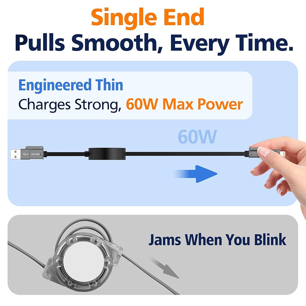 1️⃣[Why 99% Retractable Cables Fail] Unlike flimsy two-handed retractable cables, AGVEE's single-end one way stretch charing cable lets you pull ONLY the device side with one hand. Engineered for 10,000+ Smooth Retractions: Our precision coil mechanism works like your favorite car window - effortless up/down movement that never jams (most fail under 100 pulls!).