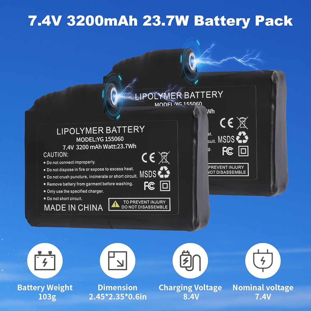 Advanced Safety Protection: Built-in safeguards with overcharge, short-circuit, overheat protection (rated 7.4V, charging 8.4V). Remove batteries before washing garments