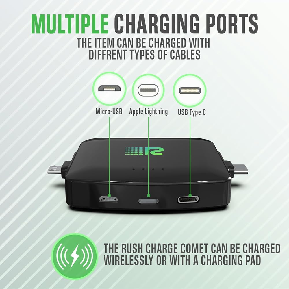 Features Pass-Through Technology: Rush Charge's patented Pass-Through power bank for iPhone allows your Rush Charge universe to be recharged while also charging up to 3 smartphones/ devices at the same time.