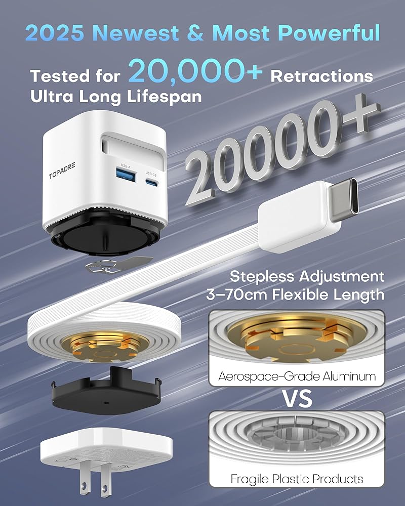 【Advanced GaN III Technology – Compact & Cool】Powered by next-generation GaN (Gallium Nitride) III technology, this retractable usb c charger delivers high efficiency with less heat in a compact body. The smart power management system ensures safe charging for laptops and mobile devices with protection from over-voltage, overheating, overcurrent, and short circuits—durable and travel-ready.