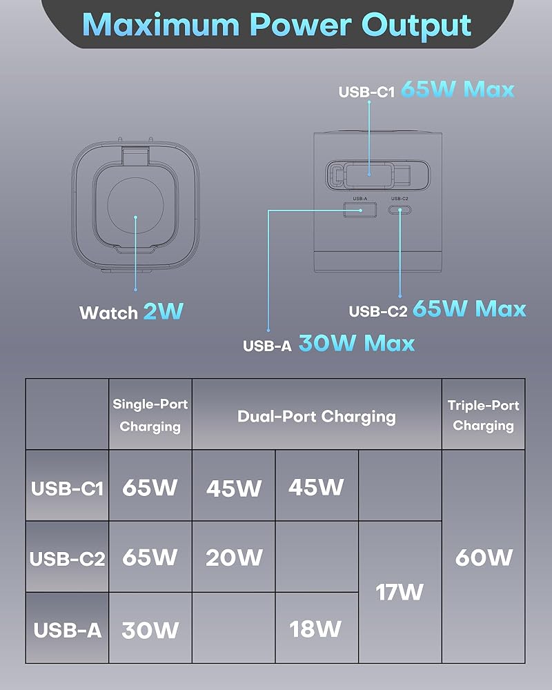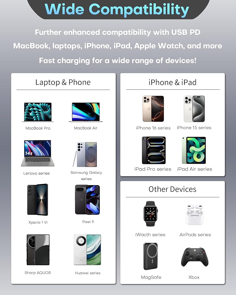 【Wide Compatibility & Universal Fast-Charge Protocols】Equipped with advanced protocols including PD 3.0, QC 4.0, and PPS 2.0, the 65W USB C charger supports nearly all modern devices. Perfect for MacBook Pro 13”, for MacBook Air (M1/M2/M3), for Apple Watch Series Ultra/11/10/9/8/7/SE, for iPhone 17/16/15/14 Pro Max, for iPad Pro/Air, Galaxy S25/S24, for HP, for DELL, Switch, and more. One compact charger, endless compatibility.